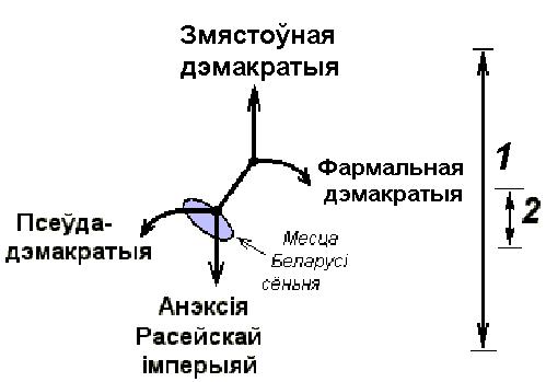 Відавочна, што неабходны грамадскі патэнцыял створыцца, калі будуць супрацьпастаўлены: грандыёзныя перавагі для нашага народу, звязаныя з перспектывай ўсталявання ў краіне змястоўнай дэмакратыі (г.зн. сапраўднай беларускай), і надзвычай цяжкія, ганебныя наступствы чарговай анэксіі расейскай імперыяй, у якую Беларусь пастаянна спаўзае (гл. малюнак. Пазначаны розныя кірункі магчымага лёсу Беларусі, а таксама: 1 – альтэрнатыва, здольная стварыць неабходны патэнцыял для перамен; 2 – прапанаваная сёння альтэрнатыва занадта малая).