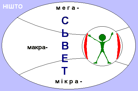 Прычына ў тым, што ў дадзенай сістэме Сьвет нібы абступае чалавецтва – ён знаходзіцца і зьнізу, і зьверху, і… з бакоў. А чалавецтва зьяўляецца часткай Сьвету, непарыўна зь ім зьвязанай. Таму дадзеную сістэму – Сьвет-Чалавецтва-Сьвет – можна прадставіць і меньш фармалізавана (так, як паказана на малюнку 2). На гэтым малюнку фігура чалавечка пазначае і людскага індывіда, і грамадства, і ўсё чалавецтва. Тое, што выдзеленыя ў межах Сьвету яго мікра-, макра- і мегасьферы (якія маюць свае законы існаваньня) арыентаваны адносна фігуркі чалавека зьнізу, збоку, зьверху, выпадкова супала зь вертыкальнай арыентаванасьцю базавага і вышэйшага. Гэтае выдзяленьне мае іншае прызначэньне (будзе разгледжана ніжэй).