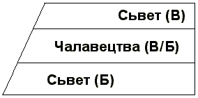Пасьля фармуляваньня, што любыя сістэмы ў рэчаіснасьці трэба ўспрымаць цэласна (С пр-п 1; https://nashaziamlia.org/2006/04/30/72/#more-72), лічу вартым разгледзець такую сістэму, як чалавецтва і Сьвет (Сусьвет). Гэта якасна іншая, выключная сістэма ў параўнаньні з усімі, рагледжанымі раней. Яе асаблівасьць заключаецца ў тым, што пры разглядзе ўзаемаадносін чалавецтва і Сьвету высьвятляецца, што Сьвет (рэчаіснасьць, у якой існуе чалавецтва) зьяўляецца ў межах дадзенай сістэмы базавым (Б), а чалавецтва – вышэйшым (В). Пры раглядзе гэтай жа сістэмы ў іншым ракурсе атрымліваецца, што Сьвет (Сусьвет) зьяўляецца для чалавецтва вышэйшым – кіруючым (В), а чалавецтва, як адзін зь яго элементаў – ёсьць базавае (Б; гл. малюнак 1).