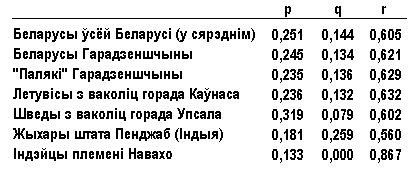 Ацаніць ступені генетычнай роднасьці народаў (папуляцый), маючы такія даныя, можна ня толькі прыблізна, «на вока», але і выразіць колькасна, у канкрэтных лічбах. Для гэтага яшчэ ў пачатку ХХ стагоддзя было запрапанавана шэраг формул. Адну з самых простых запрапанаваў А.С.Сераброўскі (гл. унізе). Выкарыстоўваючы яе кожны з вас можа самастойна вызначыць ступень генетычнай блізкасьці (J) прыведзеных у табліцы папуляцый.
