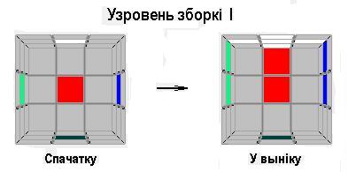 У працэсе зборкі на першым узроўні трэба паставіць “дзьвюпавярхоўныя” бакавыя “кубічкі” на гранях верхняй плоскасьці так, як паказана на малюнку ніжэй (шэрым фонам паказаны ўсе іншыя “кубічкі”, на разьмяшчэньне якіх ня варта зьвяртаць увагу). Звычайна ніякіх дадатковых інструкцый для складаньня кубіка Рубіка на гэтым этапе не патрабуецца. Людзі ў абсалютнай большасьці здольны вельмі лёгка здагадацца, як усё выканаць.