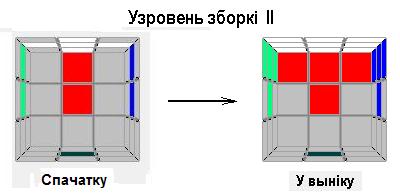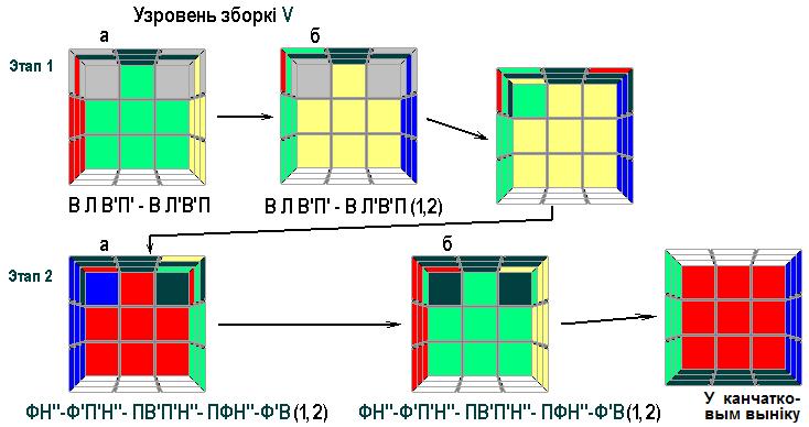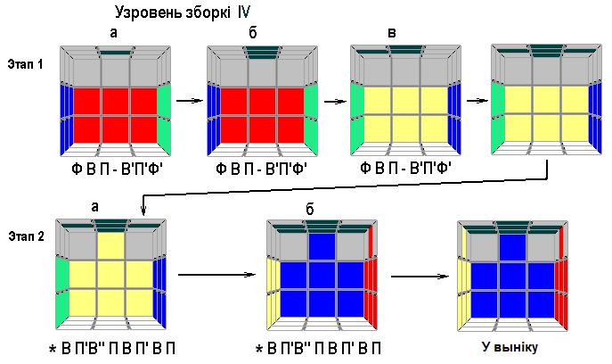 І, нарэшце, апошні 5-ы ўзровень зборкі. Ён таксама складаецца з двух этапаў. Тут, наадварот, спачатку трэба ўсталяваць рагавыя “кубічкі” на іх нармальныя месцы (першы этап), а затым павярнуць іх так, як трэба (другі этап).