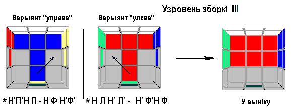 На трэцім узроўні зборкі звычайна ўжо патрабуюцца інструкцыі. Яны і пададзены ніжэй на малюнку. Вялікімі літарамі пазначаюцца паверхні, якія трэба паварочваць (яшчэ раз паглядзіце на малюнак у пачатку артыкула). Калі паверхню трэба паварочваць на 90 градусаў па стрэлцы гадзіньніка – яна пазначаецца толькі літарай, калі супраць – літарай з апострафам. Калі літара мае два апострафы, паверхню трэба павярнуць на 180 градусаў. Сімвалам * пазначаецца падводка паверхняў пад зыходны стан, паказаны на малюнку зьлева.