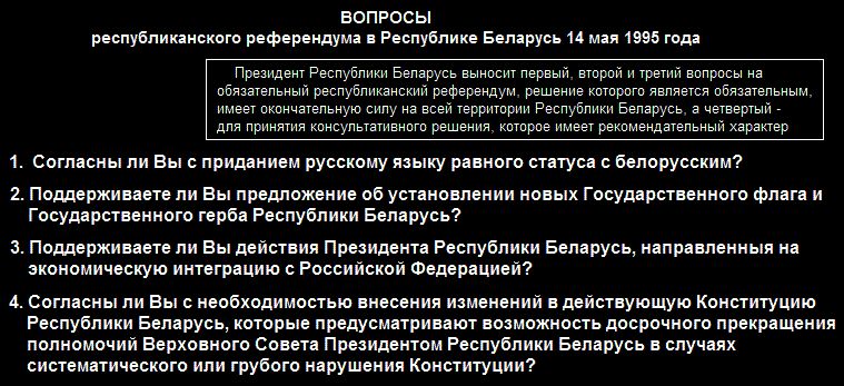 1. У дадатак да выдатнага артыкулу С.Навумчыка прыводзім пытаньні гэтага так званага “рэферэндуму” 1995 году. Просім зьвярнуць увагу, як фармулявалася пытаньне пра мову і на тое, што аб’яўлялася кансультатыўным.