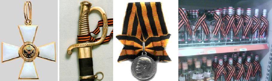 Для беларусаў і “георгіеўская стужачка”, і ўся дадзеная акцыя зьяўляюцца не такімі ўжо бязкрыўднымі. Справа ў тым, што ордэн “Сьвятога Георгія” быў уведзены імператрыцай Кацярынай ІІ у 1769 годе ў час руска-турэцкай вайны. Пазьней ён быў падзелены на 4 ступені і прызначаўся для ўзнагароджаньня за “ваенныя (чытай, акупацыйныя) вычыны”, а таксама за выслугу гадоў. Акрамя георгіеўскіх крыжоў і ордэнаў пазьней былі ўведзены і георгіеўскія медалі. Паколькі “Сьвяты Георгі” – гэта хрысьціянскі сьвяты, для іншаверцаў быў прадугледжаны варыянт ордэна, на якім замест яго быў герб Расеі – а гэта, увага, чорны двугаловы арол на залатым фоне (гл. малюнак, першы зьлева). Ад гэтага галоўнага расейскага імперскага сімвала сама георгіеўская стужка па законах геральдыкі і складаецца з характэрных жоўта-чорных палосаў. Такая стужка мацавалася да зброі, якой узнагароджавалі расейскіх вайскоўцаў, служыла фонам для адпаведных крыжоў, ордэнаў, медалёў, цяпер ёю ў Расеі пачалі ўпрыгожваць нават бутэлькі водкі (гл. малюнак). Калі Кацярына ІІ у самым канцы ХVІІІ стагоддзя захоплівала Беларусь, многія яе салдаты-захопнікі ўжо былі “ўпрыгожаны” гэтымі сімваламі імперскай агрэсіі. Для нас, беларусаў, “сьвятая георгіеўская стужка” – гэта яшчэ у большай ступені сімвал расейскага імперыялізму, рускага шавінізму (карацей, усходняй версіі фашызму), чым серп і молат, чырвоная зорка і чырвоны сьцяг (бо падзеі, якія адбыліся пад апошнімі ў 1939 і 1944 гг. хоць у нейкай ступені можна інтэрпрэтаваць як вызвольныя). Таму для нас, у адрозьненьне ад таго, што пра гэта думаюць расейскія нудэльманшы – гэта тое самае, што і нацысцкая свастыка! Давайце так і лічыць далей…