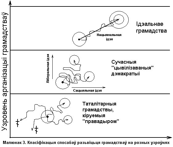У адпаведнасьці з гэтай класіфікацыяй найбольш прымітыўнымі грамадзтвамі (грамадзтвамі базавага ўзроўню) варта лічыць тыя, якія арганізаваныя паводле аўтарытарна-таталітарнага прынцыпу, г.зн. на чале з “правадыром”. Такія грамадзтвы кіруюцца яго “ідэямі”, пачуцьцямі, уяўленьнямі. Кірунак разьвіцьцёвага руху гэтых грамадзтваў можа быць самым розным. Дакладней, выпадковым. Ён залежыць ад таго, які кіраўнік “пападзецца” канкрэтнаму грамадзтву (адным пападзецца Вітаўт Вялікі ці Рузвэльт, Дэ Голь, Гандзі, Піначэт, іншым – Нэрон ці Сталін, Палпот, Хусэйн, Лукашэнка). Гісторыя чалавецтва ў час дамінаваньня таталітарных рэжымаў фактычна адбывалася ў адпаведнасьці з прынцыпамі разьвіцьця жывой прыроды, дзе больш дасканалыя грамадзтвы выжывалі, а больш прымітыўных зьнішчаў “адбор”.