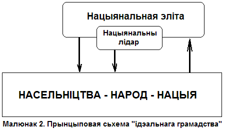 3. Насельніцтва – галоўная стваральная сіла грамадзтва. Кіруецца і правадыром (фармальна), і элітай (у існасьці). Папаўняе сапраўдную нацыянальную эліту, пэрыядычна “зацьвярджае” (праз працэдуру дэмакратычных выбараў) нацыянальнага лідара і прадстаўнікоў іншых ворганаў фармальнай улады, паступова ператвараецца ў народ, затым у нацыю.