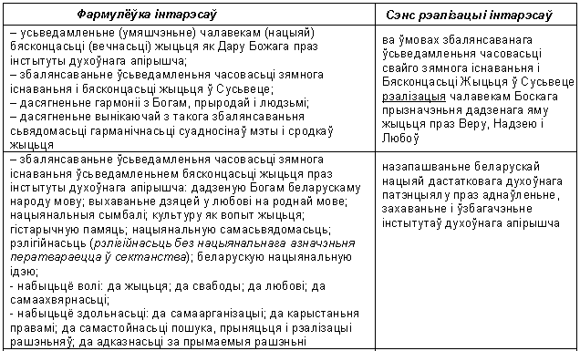 – адраджэньне, узбагачэньне i захаваньне досьведу жыцьця беларускага народу – нацыянальнай культуры, ягонага духоўнага, iнтэлектуальнага і фізіялягічнага патэнцыялу як умовы здольнасьцi нацыі браць на сябе адказнасьць;