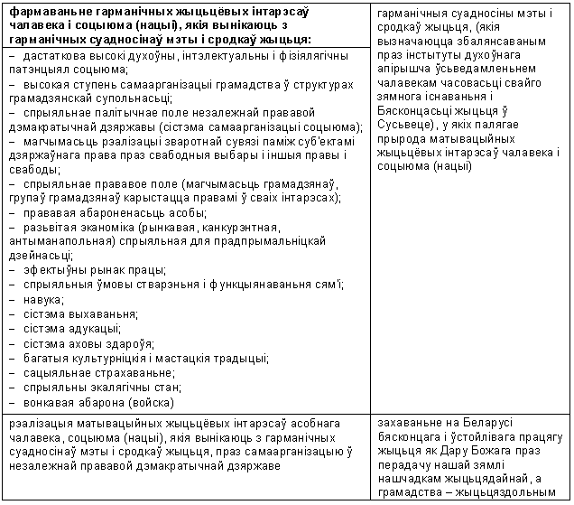 Нацыянальную ідэю можна акрэсьліць і праз нацыянальныя інтарэсы (гл. табліцу).