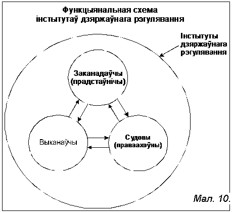 Неабходнасьць у інстытутах дзяржаўнага рэгуляваньня палягае ў іх статусе носьбітаў улады як функцыі і права ўсталяваньня нормаў права на дзяржаўным прававым полі, іх ажыцьцяўленьня і кантролю за іх выкананьнем. Калі на дзяржаўным прававым полі паміж суб’ектамі дзяржаўнага права забясьпечваецца функцыянаваньне доўгатэрміновай зваротнай сувязі (на тэрмін дзейнасьці прэзідэнта, парлямэнта), то падзел інстытутаў дзяржаўнага рэгуляваньня (падзел функцый улады) забясьпечвае функцыянаваньне аператыўнай зваротнай сувязі паміж самімі інстытутамі дзяржаўнага рэгуляваньня (так бы мовіць, у малым крузе) (гл. малюнак 10).