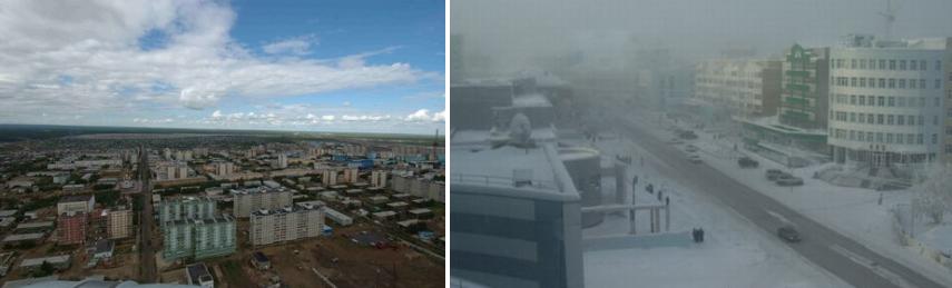Увага! Маскалямі ў адпаведнсьці з традыцыяй нашых продкаў і нацыянальных герояў (Кастусь Каліноўскі) мы завем прадстаўнікоў уладнай піраміды расейскай імперыі – імперыякратаў – непасрэдных атрымальнікаў усялякіх каштоўнасьцяў ад свайго ўладна-паразітнага стану (адносна падпарадкаванага грамадства), а таксама іх прыхлябаяў, якія, у разьліку на костку “з барскага стала”, таксама карыстаюцца імперскім сьветаглядам, падтрымліваюць і прапагандуюць яго. У цяперашняй РФіі да апошніх належаць многія акторы, прапагандысты, журналісты… Адзін з такіх журналістаў Дзьмітры Сьцешын улетку г.г. наведаў Якуцію і напісаў вялікі артыкул у прыўладнай газетцы “Камсамольская праўда” (КП). Паколькі толькі што мы пазнаёміліся з поглядам на праблемы якуцкага народу некаторых яго перадавых прадстаўнікоў, будзе цікавым паглядзець на тое ж з ракурсу прапагандыста расейска-рускай імперска-шавіністычнай ідэалогіі. Кожны чытач сам можа заняць бок тых, хто яму бліжэй. Мы ж па нашай завядзёнцы не заўсёды стрымліваліся, калі ўзьнікала жаданьне тыя ці іншыя думкі аўтара пракаментаваць [як заўсёды, у квадратных дужках]. Матэрыял узяты з сайта www.dpni.org. На фота ўверсе Якуцк летам і зімой.