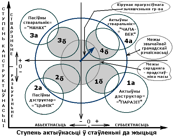 Чалавек можа быць адносна сярэдніх грамадскіх паказчыкай канструктывістам і дэструктывістам, суб’ектам і аб’ектам, але, застаючысь у межах агульнапрынятых норм, ён будзе заставацца адносным канфармістам (на мал. 2.21 пазначаны, як 1б, 2б, 3б, 4б, што знаходзяцца ў межах велькага кола).