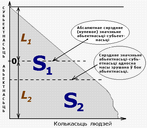 Мал. 2.22. З-за таго, што доля людзей у грамадстве, якія гатовыя выступаць у ролі аб’ектаў грамадскай рэчаіснасьці, больш, чым тых, хто гатовы быць суб’ектамі ў адносінах да яе, агульны паказчык суб’ектнасьці-аб’ектнасьці сёньняшняга грамадства застаецца зрушаным у бок аб’ектнасьці. Пазначана: L1 – узровень суб’ектнасьці чалавека (колькі разоў ён выступае ў ролі суб’екта адносна рэчаіснасьці – ён спрабуе кіраваць), L2 – узровень аб’ектнасьці чалавека (як часта кіруюць ім); S1 і S2 колькасьці людзей у грамадстве. Пры гэтым, S1 = S2, а L1 = L2.