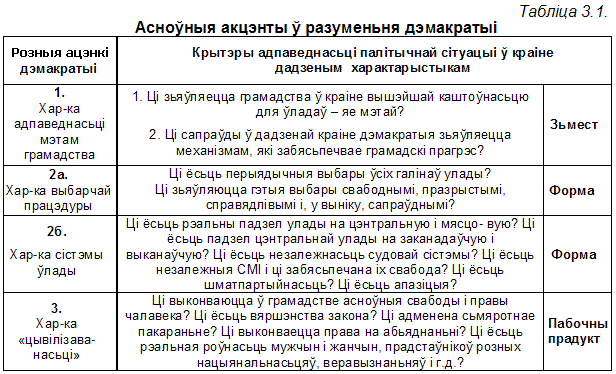 Сёньня названыя асьпекты дэмакратыі варта бачыць так, як паказана ў табліцы 3.1 (пры гэтым 1-я характарыстыка самая важная, 2-я – меньш важная, 3-я – найменьш важная; пры гэтам пасьлядоўнасьць ацэнкі не мяняецца).