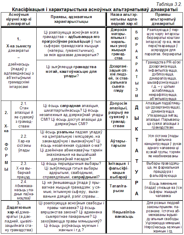 Для таго, каб дапускаць меньш памылак тым, хто мала знаёмы з беларускай рэчаіснасьцю ці ў цэлым з прыёмчыкамі бюракратыі (а тэарэтычная верагоднасьць малазнаёмства з такімі праблемамі вельмі высокая – у разьвітых дэмакратыях бюракратыя, як правіла, знаходзіцца пад жорсткім кантролем істотна больш суб’ектнага грамадства ды ўладальнікаў вялікага капіталу і таму ня можа прадэманстраваць усіх «сваіх магчымасьцяў» у поўным абьёме), прапаную класіфікацыю альтэрнатываў дэмакратыі, прадстаўленую ў табліцы 3.2.