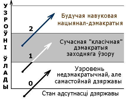 Мал. 3.4. Дзьве групы праблем, якія стаяць перад «правільнай» партыяй. Першая (пазначана 1) – гэта праблемы пераходу ад розных форм недэмакратыі да дэмакратыі; другая (пазначана 2) – гэта праблемы, зьвязаныя зь неабходнасьцю дасканаленьня сучаснай «класічнай» дэмакратыі заходняга ўзору. З пазіцый цяперашняга стану беларускай рэчаіснасьці першая група праблем успрымаюцца як навукова-практычныя, а другая – як выключна навуковыя, тэарэтычная.