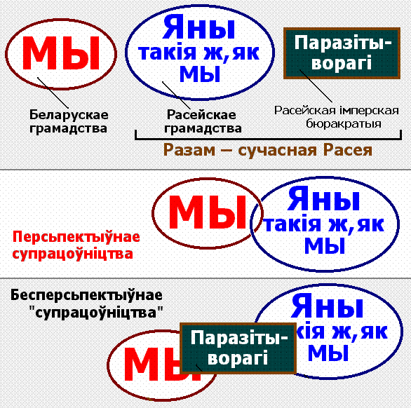 Мал. 5.7. Персьпектыўная і бесперсьпектыўная формы супрацоўніцтва беларускага грамадства-народу з расейскім грамадствам. Персьпектыўным зьяўляецца толькі такое супрацоўніцтва, якое адбываецца без удзелу асноўнай паразітычнай групы Расеі – расейскай імперскай бюракратыі.