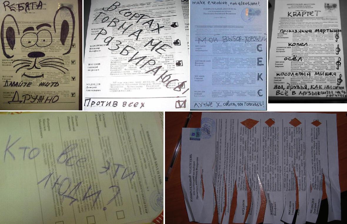 Пра першы (па часе) з такіх выпадкаў можна прачытаць тут: www.podrobnosti.ua/power/elections/2008/03/02/501420.html. «Масавае ўкіданьне бюлетэняў яшчэ да адкрыцьця выбарчага ўчастка №1513 (у Маскве) зафіксаваў назіральнік Раман Удот. Ён паведаміў наступнае: «У абедзьвюх урнах для галасаваньня я выявіў пачкі бюлетэняў – каля 100 штук, як мінімум. Яны былі адзначаны «за» кандыдата Мядзьведзева». Па словах Удота, ён выклікаў міліцыю, якая апячатала адну урну, а ў другую ўсё роўна «пачалі кідаць бюлетэні, паколькі выбарцы ўжо пайшлі»».