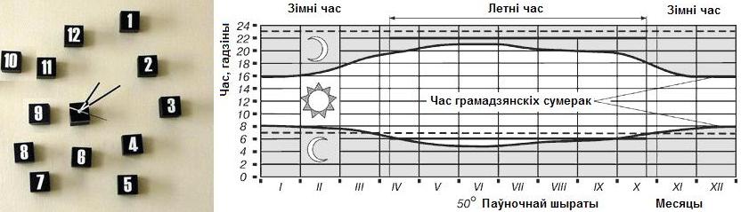 На малюнку ўверсе паказаныя зьмены сьветлага і цёмнага часу сутак на працягу года для шыраты 50 градусаў (шырата Кіева і Менска). Мяжой паміж сьветлым і цёмным часам прынята лічыць пачатак і канец так званага грамадзянскага прыцемку – г.зн. час, калі Сонца знаходзіцца за гарызонтам на 6 градусаў. Па вечарах у гэты момант на вуліцах гарадоў трэба ўключаць асьвятленьне.