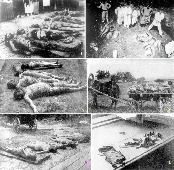 3. Целы чатырох сялян-закладнікаў (адзін зь іх хлопчык). Твары нябожчыкаў страшэнна парэзаныя. Асаблівым ізуверскім чынам скалечаны палавыя органы. Лекары, якія рабілі эксьпертызу, казалі, што такі прыём па ступені сваёй балючасьці пераўзыходзіць усё, што можа ўявіць сабе чалавек.