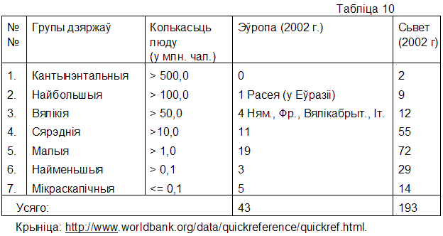 Расейскі навукоўца С. Лаўроў (2002) згрупаваў дзяржавы Эўропы паводле велічыні люду на 4 групы. У групу буйнейшых зь велічынёй люду больш 100 млн. папала Расея (дакладней яе эўрапейская частка). Да буйных зь велічынёй люду ад 50 да 100 млн. чал. – Нямеччына, Вялікабрытанія, Францыя, Італія, Украіна (аднак апошняя ўжо мае колькасьць люду меньшую 50 млн. чал. на 2007 г.). 11 эўрапейскіх дзяржаў сфармавалі групу сярэдніх з колькасьцю люду ад 10 да 50 млн. чал., а наша Бацькаўшчына разам з 28 (!) дзяржавамі ўвайшла ў групу малых дзяржаў зь велічыней насельнікаў меньш 10 млн. чал. (у т. л. аж 10 мікрадзяржаў, што змогуць налічыць толькі меньш 500 тыс. чал.).
