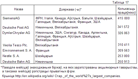 Колькасьць працаўладкаваных ў кожнай з 21 найбольшых (паводле колькасьці работнікаў) ТНК сьвету большая ад колькасьці людаў кожнай з 22 найменьшых дзяржаў сьвету. Найбольшая карпарацыя – Wal–Mart Stores Inc. (USA) мае колькасьць працаўнікоў аж 1 млн. 500 чал., што больш колькасьці людаў паасобку 51 найменьшай дзяржавы сьвету, напрыклад такіх дзяржаў UE як Эстонія, Мальта, Кіпр, Люксэмбург.
