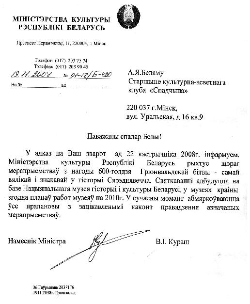 Ніжэй прыводзяцца гэтыя адказы (з самім зваротам можна пазнаёміцца, напрыклад, тут: https://nashaziamlia.org/2008/10/24/1571). Зьвярніце ўвагу, толькі Міністэрства фінансаў РБ дазволіла сабе парушыць закон і даць адказ сп-ру Беламу не на нармальнай мове. Што ж, час ідзе, а напісанае застаецца… Але ў цэлым прыемна, што ўсе адказы носяць пазітыўны кантэкст.