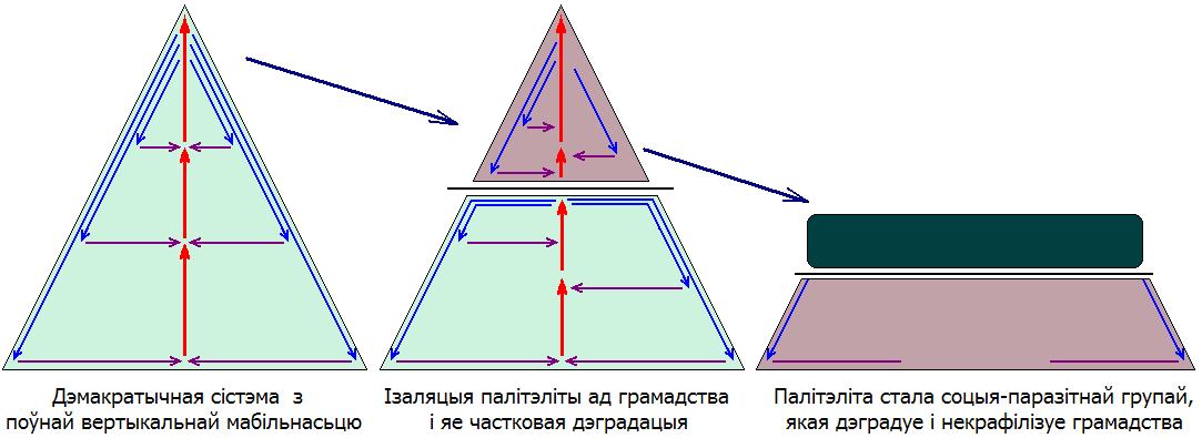 Аднак такая ізаляцыя аўтаматычна вядзе да дэградацыі палітычнай “эліты”, бо ў сацыяльных паразітаў няма аб’ектыўных інтарэсаў, усе іх каштоўнасьці суб’ектыўныя, скіраваныя на тое, як лепш жыць самім. Гэта вядзе да ператварэньня палітычнай “эліты” ў соцыя-паразітнага бюракратычнага монстра (у Беларусі з-за выключна абмежаванага сьветагляду мы прапануем зваць яго цяперцамі). Для ўтрыманьня ва ўладзе гэтая бюракратыя, акрамя ізаляцыі, звычайна ўключае дадатковую стратэгію – дэградацыі й некрафілізацыі грамадства (праз грамадскія дэзарыентацыю, шызафрэнізацыю, абыдленьне; гл. таксама Д пр-п 29). У выніку ўзьнікае сітуацыя, калі на паверхні грамадства паступова ўтвараецца нібы корка, лядовая крыга (ці бятонная пліта), якая цісьне на грамадства, сплюшчвае яго і не дае ніякай магчымасьці агульнанацыянальным інтарэсам выбіцца на паверхню жыцьця, на кіраўнічы ўзровень грамадства (гл. малюнак уверсе). Усё, што адбываецца на паверхні, адбываецца толькі зыходзячы з суб’ектыўных інтарэсаў паразітнай бюракратыі (цяперцаў).