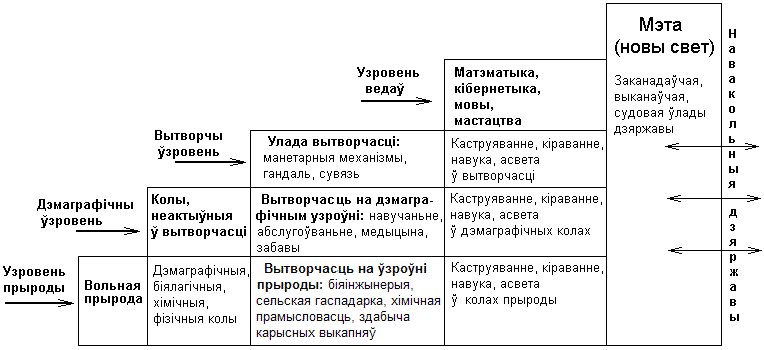 Мал. 5. Піраміда сьветаглядых узроўняў чалавека. Пазначана: 0 – чалавек на біялагічна-базавым узроўні, чалавек-жывёла (прысутнічаюць патрэбы ў ежы, жытле, здароўі, бясьпецы, нашчадках); 1 – індывідуальна-эгаістычны ўзровень чалавека, чалавек-эгаіст (патрэбы ў індывідуальнай свабодзе, індывідуальным матэрыяльным дабрабыце, уладзе, ведах, самапавазе); 2 – сямейна-калектывісцкі ўзровень чалавека, чалавек-калектывіст (патрэбы ў любові, сяброўстве, жаданьне росквіту “сваёй” групы); 3 – чалавек на агульнанацыянальным узроўні, чалавек-дэмакрат (патрэбы мець свой народ, жаданьне дабра і прагрэсу для яго; дзяржаўная незалежнасьць; нацыянальныя мова, культура, гісторыя; нацыянальная годнасьць, дэмакратычны лад; сацыяльная справядлівасьць); 4 – агульнацывілізацыйны ўзровень, чалавек-гуманіст (прысутнічае жаданьне неабмежаванага прагрэсіўнага разьвіцьця для ўсяго чалавецтва; глабальны распаўсюд навуковай праўды); 5 – вышэйшы сьветаглядны ўзровень, чалавек-сьветаглядны (патрэба ў тым, каб прагрэсіўнае разьвіцьцё чалавецтва адбывалася заўсёды ў правільным кірунку, каб яно ўвесь час арыентавалася на заканамернасьці натуральнага разьвіцьця ўсяго Сьвету).