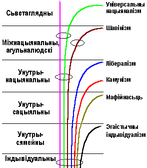 Ня буду хаваць, гэта ня столькі мой артыкул, колькі перароблены матэрыял, пададзены на адным з рускіх шавіністычных сайтаў. Проста зь яго было нешта выкінута, з-за чаго памер артыкула скараціўся прыкладна ўдвая, а нешта перапраўлена. Ён быў ня толькі перакладзены на нашу мову, а і, галоўнае, словы «Расея», «рускі», у ім былі заменены на словы «Беларусь», «беларускі», а словы Жырыноўскі, Рагозін, Зюганаў на сімвалічныя А.Л., В.В., С.Г., З.П., А.М. і г.д. Такім чынам, па-першае, было вырашана праверыць гіпотэзу, што шавіністы (якімі зьяўляюцца нашы расейскія апаненты) і ўніверсальныя нацыяналісты (якімі, як мінімум, зьяўляюцца сябры нашай рэдакцы) на ўзроўні стаўленьня да праблем уласнага народу практычна не адрозьніваюцца (гл. сьхему; на ёй зьлева паказаны асноўныя ўзроўні грамадскай арганізацыі, а справа – назвы адпаведных сьветаглядаў і ідэалогій), але адрозьніваюцца па адносінах да праблем міжнацыянальных (шавінюгі тут жа адхіляюцца ад лініі, якая ідзе ўгару; але дадзеныя праблемы ў артыкуле не разглядаюцца – пра гэта вядома зь іншых крыніц). Па-другое, хацелася пераканацца ў правільнасьці нашых поглядаў на праблему фінансаваньня беларускага дэмакратычнага руху, якія сфармуляваны раней (гл. П пр-п 3 і адпаведны артыкул).
