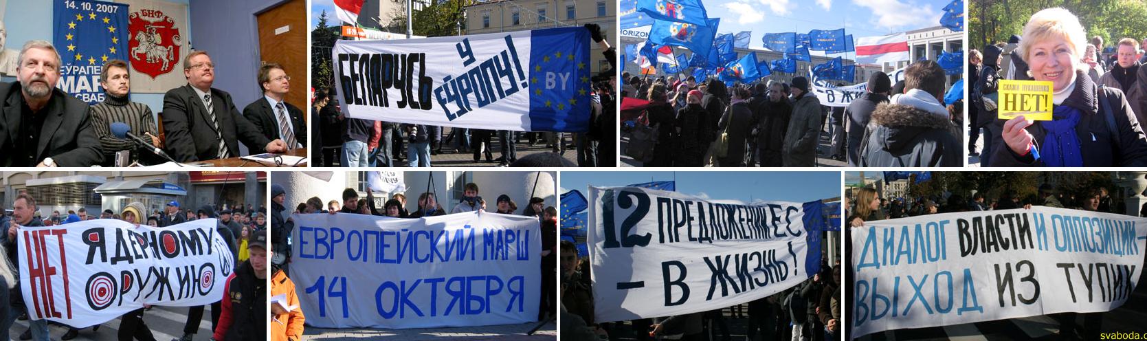 У адпаведнасьці з нашым месцам у беларускай ідэалагічнай прасторы мы павінны былі б ацаніць падзею, якая адбылася ў Менску 14 кастрычніка г.г. па ініцыятыве “аб’яднанай апазіцыі”. Мы азнаёміліся з фактычным бокам справы (гл., напрыклад, тут http://svaboda.org/articlesfeatures/politics/2007/10/E85C0EF8-CE2A-453C–A634-F8E870A7FC96.html; http://svaboda.org/articlesfeatures/politics/2007/10/E68F83C6-D1ED-48BC-968A-7F9972D7E8FD.html; http://svaboda.org/articlesfeatures/politics/2007/10/916CD8FB-7187-42FC–AFB2-C4F84D10A56A.html; http://svaboda.org/articlesfeatures/politics/2007/10/03E3AB2B-327D-4631-825B-91FE724D571F.html), з аналізамі сп-роў Карбалевіча, Старыкевіча, Быкоўскага (гл. тут http://svaboda.org/articlesfeatures/politics/2007/10/B0536DCD-5587-4A51-88EA–ABDB4183AD7F.html; http://svaboda.org/articlesfeatures/politics/2007/10/45A5FAE6-0C77-4483-B806-C40093636EAD.html), праглядзелі ўсе 7 фотарэпартажаў, выстаўленых на сайце радыё “Свабода” і ўжо сабраліся выкладаць наша бачаньне падзеі. Але гэта суправаджалася такімі непрыемнымі пачуцьцямі, што ўрэшце мы палічылі за лепшае зафіксаваць толькі тры феномены – значнае адступленьне аб’яднанцаў ад беларускай мовы і нацыянальнай сімволікі (гл. падборку фотадакументаў – нягледзячы на вельмі ўдалы дзень, усё было затоплена чорна-сінімі колерамі й сапсавана гнілым патураньнем моўнаму этнацыду; гэта першы феномен); раздзельнае шыхтаваньне сілаў Мілінкевічам і другой часткі “аб’яднанай апазіцыі” (высьвятлялі, хто галоўны) ва ўмовах стараннага піараньня менавіта першага фотакарэспандэнтамі (другі феномен); ўзаемнае завочнае імкненьне дагадзіць: аб’яднанцы – цяперцам, цяперцы – аб’яднанцам (напрыклад, што значыць “Беларусь ў Еўропу”, а Лукашэнку куды падзенем?; раней ведалі куды; гэта трэцяе). Паколькі нашыя погляды на тое, хто ёсьць аб’яднанцы, у значнай ступені супадаюць з поглядамі Зянона Пазьняка, мы вырашылі замест нашага аналізу падаць яго артыкул, які зьявіўся ў сеціве напярэдадні падзеі (нашае ж стаўленьне да планаванага “маршу” мы выказалі яшчэ ўлетку – гл. тут: nashaziamlia.org/2007/08/16/854). Тых, хто хацеў бы пабачыць менавіта наш аналіз адбылага, заклікаем не засмучацца – матэрыялы, прысьвечаныя “маршу”, мы яшчэ выкарыстаем для больш глыбокага аналізу стану г.зв. “аб’яднанай апазіцыі” (пра свае абавязкі што да Д-прынцыпа 66 мы памятаем).